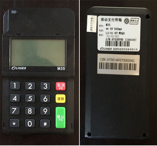 从商户提供的POS机具来看,外形酷似手机,机身前面有明显银联认证标志,机身背面则贴有通联支付的标志,标明型号、通讯接口等信息。从机具来看,是非常典型的手刷POS。