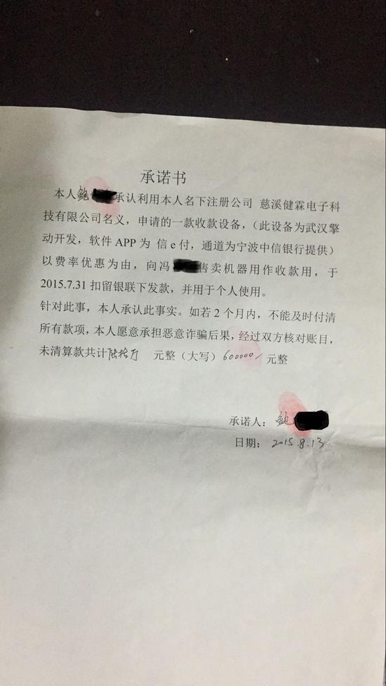 而鲍某本人签的承诺书中显示,其利用名下注册公司慈溪健霖的名义,申请一款收款设备(此设备为武汉擎动开发,软件APP为信e付,通道为宁波中信银行提供)以费率优惠为由,向商户冯某售卖机器用作收款,于2015年7月31日扣留银联下发款,用于个人使用。