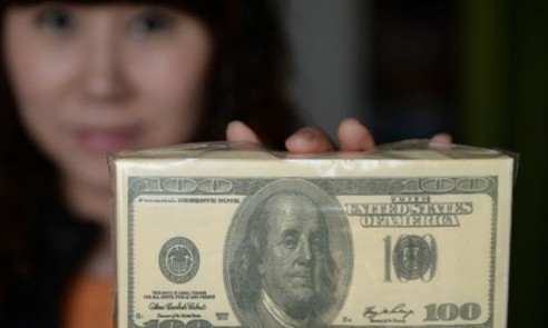 2月22日,一位上海市民在展示其购买的一包百元'美钞'餐巾纸。