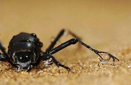 这种外表普通无奇的甲虫却会用一种非常与众不同的方法收集水分。纳米布沙漠(namib desert)的降水非常稀少,因此当海岸雾霭被风吹入内陆时,这种甲虫就会倒立在沙漠里,用自己的后腿收集空气里的小水珠。