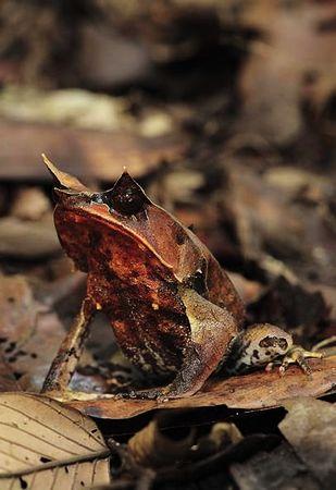这种两栖动物精心伪装成树叶,如果不仔细分辨,很难把它与它潜伏的地面区分开来。这种蛙很少四处走动,它会守株待兔,等到螃蟹、蜥蜴、小型啮齿动物和其他蛙类靠它特别近时,突然发动攻击,把猎物整个吞下。
