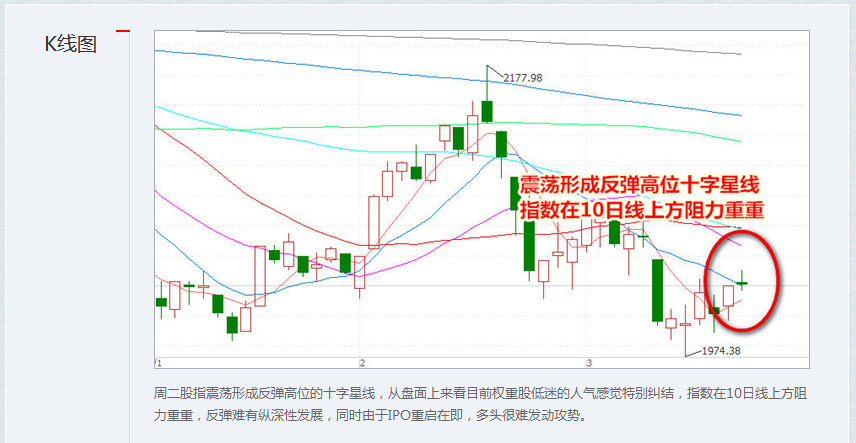 股指周二震荡形成反弹高位的十字星线,从盘面上来看目前权重股低迷的人气感觉特别纠结,指数在10日线上方阻力重重,反弹难有纵深性发展,同时由于IPO重启在即,多头很难发动攻势。