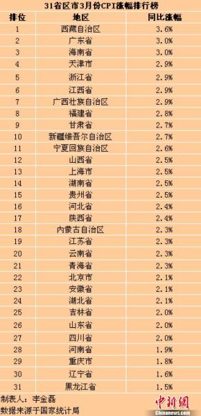 在31个省区市中,西藏3月份CPI同比涨幅最高,为3.6%,广东和海南涨幅同为3.0%,这三地是仅有的涨幅处于“3”时代的地区;黑龙江涨幅最低,仅为1.5%。