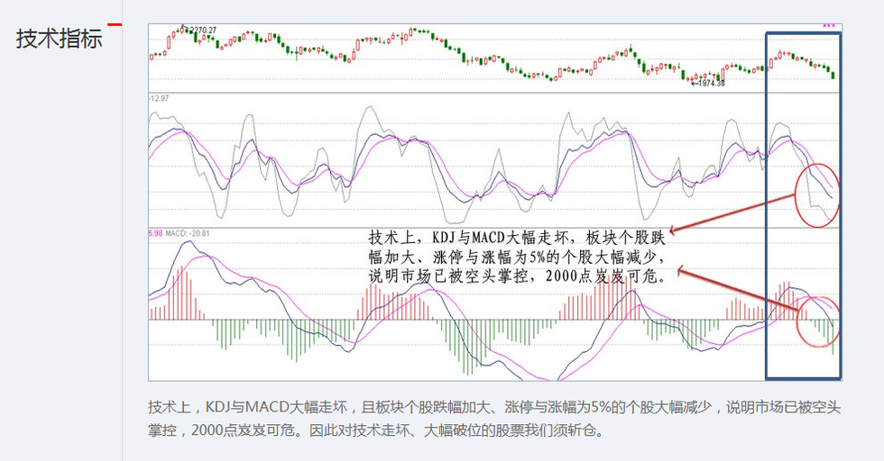技术上,KDJ与MACD大幅走坏,且板块个股跌幅加大、涨停与涨幅为5%的个股大幅减少,说明市场已被空头掌控,2000点岌岌可危。因此对技术走坏、大幅破位的股票我们须斩仓。