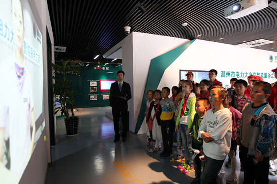 在全国“电力科普教育基地”——温州市电力大客户智能服务之家,孩子们仔细聆听讲解员的讲解。 刘海生 摄影