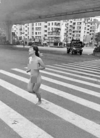 记者从“Sincere615”提供的照片上看到,裸奔女子身材微胖,留着长头发,头发上还绑着红花。记者注意到,女子跑过斑马线时,红绿灯显示的是红灯禁行状态。从女子脚上的污渍看,女子奔跑应该有一段距离了。“Sincere615”告诉记者,事发地点位于莲岳路上原松柏汽车站附近。