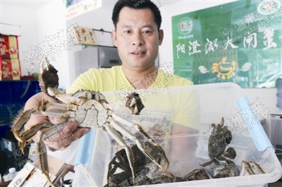 温州一些阳澄湖大闸蟹专卖店已开始销售提前捕捞的大闸蟹。图为雄蟹。