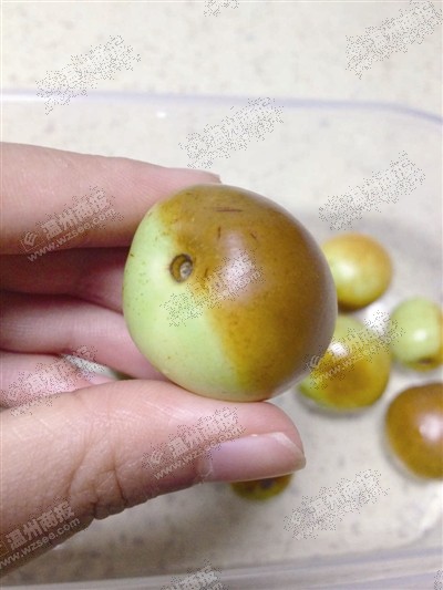 1.看冬枣红色部分的纹路,如果和青色的部分“泾渭分明”,呈明显线状,那很可能泡过热水。因为染色时,冬枣浮于水面上,沾到水的部位变红,没沾到水的部位不会变色。捞上来过夜后,即呈现一片片的红色,多为暗红或铁锈红。自然成熟的冬枣,由青到红的渐变色或斑状纹路存在。