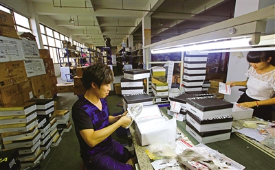 在温州经济技术开发区青年电商产业园内,某家电商员工正为客户拍下的商品验货。