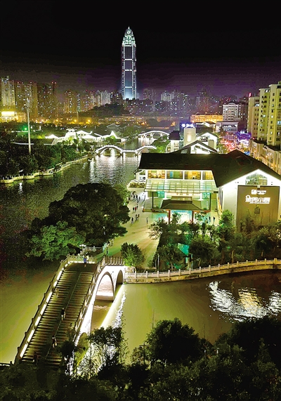 夜幕下,瓯江两岸流光溢彩,月色南塘如诗如画,雁荡夜景美名远播,傍晚的塘河两岸休闲健身活动如火如荼……