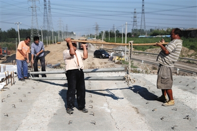 按规划,由河北方面修建的潮白河大桥,连接正在修建的徐尹路和燕郊已经修好的北外环,但目前,河上只有黄土堆砌成的一座不成形的“土桥”供人员通行,“土桥”最狭窄的地方,骑车的人只能推车前行。据记者统计,在一个小时内有36人从这简陋的“土桥”前往燕郊。