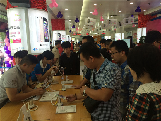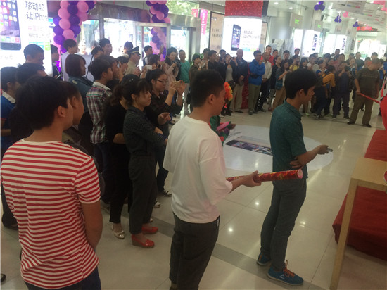 iPhone 6/ 6 Plus开售的今天,尽管是工作日,也依然还是有大批顾客赶到营业厅排队抢购移动4G版iPhone 6。当记者赶到人民东路移动营业厅时,套着苹果头套的一大波“苹果人”在兴奋地跳着“小苹果”助阵此次的开售,吸引了众多市民驻足围观。而在苹果专柜,前来购买苹果6的消费者也都排起了长队,看得出市民对移动4G版iPhone 6/ 6 Plus充满期待。