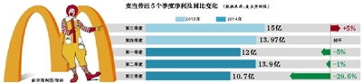 麦当劳财务数据显示,进入2014年,麦当劳全球的净利就开始进入下滑趋势,从第一季度的下滑5%至目前下滑30%。同店销售额也持续下降。