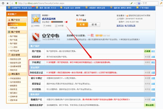 第三步:注册好之后,找到个人的安全中心,把里面的“手机绑定”和“身份信息认证”都填好,然后刷新一下查看账户。