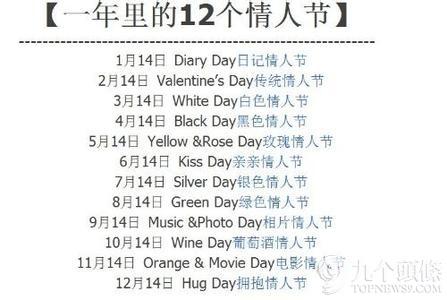 喝酒、吃炸酱面甚至唱歌跳舞,这些韩国人喜爱的活动都包括在每月14号的情人节里。而从这些情人节的名字中可以看出,这些都可以作为商家的节日。