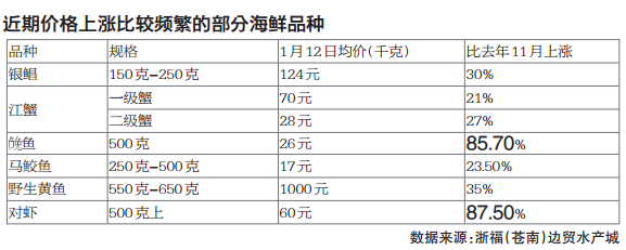 不过,临近春节,随着市场上海鲜需求量逐渐加大,海鲜市场又将迎来新一轮涨价潮。“受冷空气影响,海鲜产量有所减少,渔民捕捞作业难度提升,是最近海鲜价格回升的重要影响因素之一。”浙福边贸水产城信息记录员陈良株分析指出,受北方寒流持续不断影响,本地海捕类水产品相应减少,上月各类节日也在无形中拉动消费,农历十月又是传统婚嫁高峰月份,酒店采购量加大也是海产品涨价的另一客观因素。
