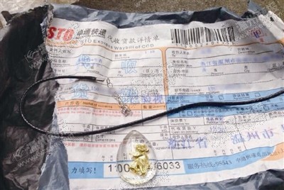 “今天中午下班回家,奶奶告诉我收到了一个快递,给了18元邮费,并说是一个金坠子。”姚女士把这条挂饰拿近一看,发现所谓的金挂饰非但没有任何标明材质的标识,材质一摸便知是廉价的塑料,根本不值几元钱。