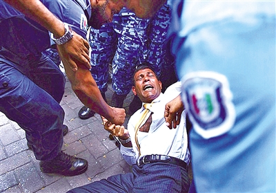 马尔代夫前总统穆罕默德·纳希德因涉嫌违反反恐法被逮捕,23日被警察强行拽入首都马累一家法庭,出席审前听证会。