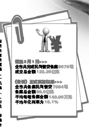 3月1日,《温州市民间融资管理条例》迎来周年生日。作为全国首部金融地方性法规和首部专门规范民间金融法规,《条例》的诞生是民间借贷规范化、阳光化、法制化的重大突破。市金融办数据显示,截至3月1日,全市共完成民间借贷备案9678笔,成交总金额122.28亿元。其中,《条例》正式实施以后,全市共备案民间借贷7054笔,备案总金额98.8亿元,平均每笔备案金额140.06万元,平均年化利率为16.1%。登记备案逐渐成为温州民间借贷过程中的重要一环。
