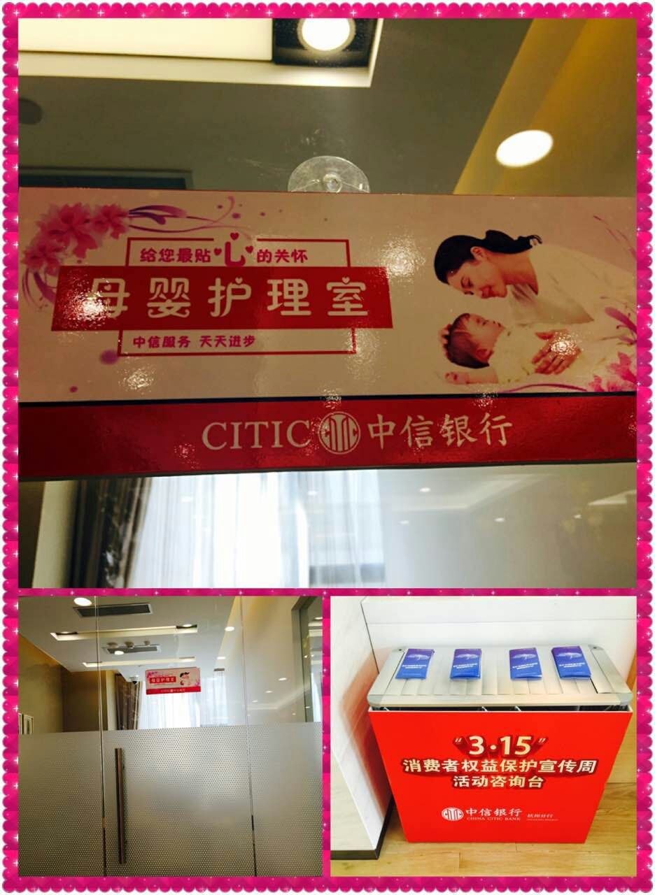 3月14日-3月15日,针对残障人士、抱小孩的女性客户(孕妇)、老年客户,中信银行杭州分行各网点将重点向他们介绍防范诈骗、鉴别人民币真伪等金融小常识,并向他们赠送验钞笔等以表达对特殊群体的关爱。而且从3月15日起,中信银行杭州分行辖内各网点均将特别设置一间“母婴护理室”,为怀抱婴儿的女性客户提供照顾婴儿的场所。