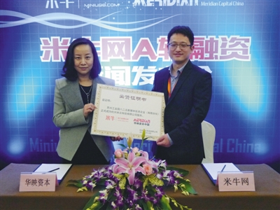 图为华映资本中国创始管理合伙人季薇(左)与米牛网CEO柳阳在投资交接仪式上。金乐平摄