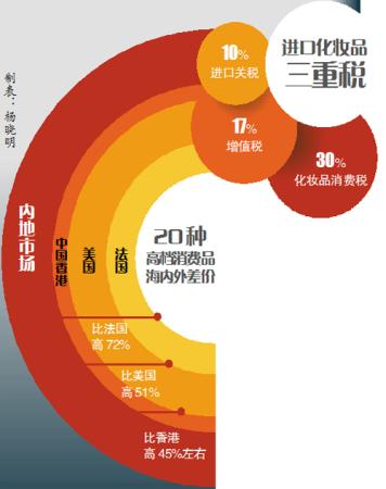 比如,根据现行进出口税则,进口香水要缴纳10%的关税、17%的进口货物增值税和30%的进口货物消费税;部分葡萄酒的进口关税高达65%,另需缴纳17%的进口货物增值税和10%的进口货物消费税。
