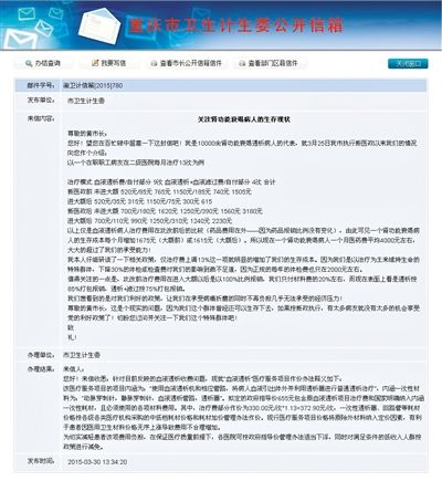 重庆市卫计委公开信箱“关注肾功能衰竭病人的生存现状”问答截图。