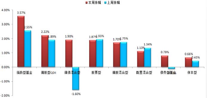 1、与基础市场相应,各类型基金普货正收益,偏股基金领涨市场,尤其是指数型基金大涨3.57%;受转债回暖,偏债混合表现较好。