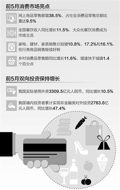 大众化餐饮、基本生活用品消费有所加快。大众化餐饮消费成为市场主流,1—5月全国餐饮收入同比增长11.5%,增幅较上年同期加快1.3个百分点,其中限额以下餐饮企业收入增长13.5%,高出限额以上7.3个百分点。