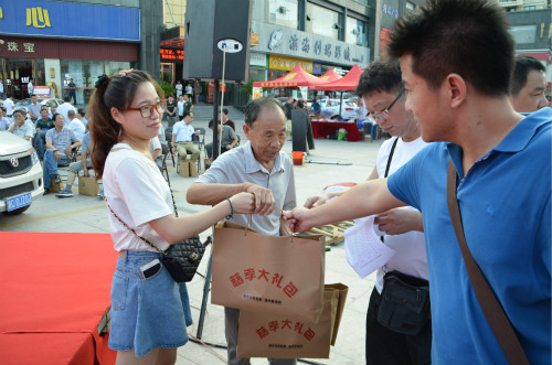 活动开设了主舞台区、闲置物品换购区、商品销售区、汽车展销区等四个区域,主办方在现场还开展了关爱社区空巢老人的活动。广场附近3个街道的空巢老人在街道工作人员的带领下来到广场。当工作人员把准备好的爱心大礼包发给老人时,老人们难掩激动的心情,纷纷说道:“感谢你们的关心,这么热的天,大老远过来送这么多好东西给我们。”