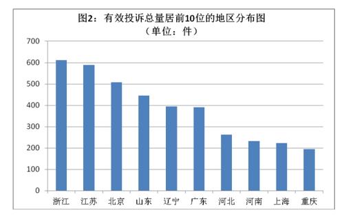 (一)有效投诉总量居前10位地区。2015年一季度,中国保监会机关和各保监局收到消费者有效投诉共5439件,有效投诉总量居前10位的地区依次为:浙江(611件)、江苏(588件)、北京(507件)、山东(446件)、辽宁(394件)、广东(391件)、河北(262件)、河南(233件)、上海(223件)、重庆(194件)。