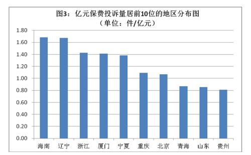 (二)亿元保费投诉量居前10位地区。从各地区单位保费的投诉件数分析,全国亿元保费投诉量平均值为0.65件/亿元,亿元保费投诉量居前10位的地区依次为:海南(1.68件/亿元)、辽宁(1.67件/亿元)、浙江(1.43件/亿元)、厦门(1.41件/亿元)、宁夏(1.38件/亿元)、重庆(1.09件/亿元)、北京(1.07件/亿元)、青海(0.87件/亿元)、山东(0.86件/亿元)和贵州(0.81件/亿元)。