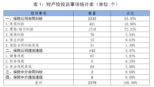 (一)财产险。消费者投诉事项涉及财产险的共有2379个。其中,保险公司合同纠纷类投诉2235个,涉嫌违法违规类投诉142个;保险中介合同纠纷类投诉2个。