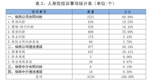 (二)人身险。消费者投诉事项涉及人身险的共有3220个。其中,保险公司合同纠纷类投诉2221个,涉嫌违法违规类投诉977个;保险中介合同纠纷类投诉6个,涉嫌违法违规类投诉16个。