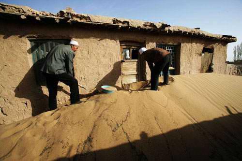 内蒙古阿拉善沙漠,乌兰布沙漠边沿的巴彥树贵村,十年前盖的房子离沙漠还有100多米,现在沙漠己包围了房子。