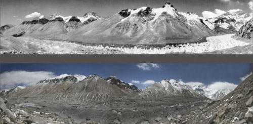 珠峰冰川对比图片。上图为1968年中科院珠峰考察时拍摄的中绒布冰川;下图为绿色和平2007年拍摄的中绒布冰川。