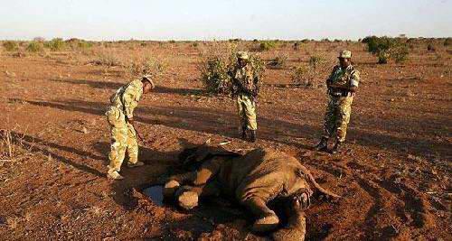 在肯尼亚的东察沃国家公园,野生动物管理人员查看一头大象的尸体。肯尼亚野生动物保护局说,近来发生的严重干旱已导致肯尼亚东南部察沃国家公园内的100多头大象死亡。