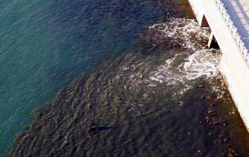 2008年11月24日,湖北宜昌市长江铁路大桥北岸桥墩上游约50米处,两个人工涵洞不停地向长江“吐”着墨汁般的污水,染黑一片江水。