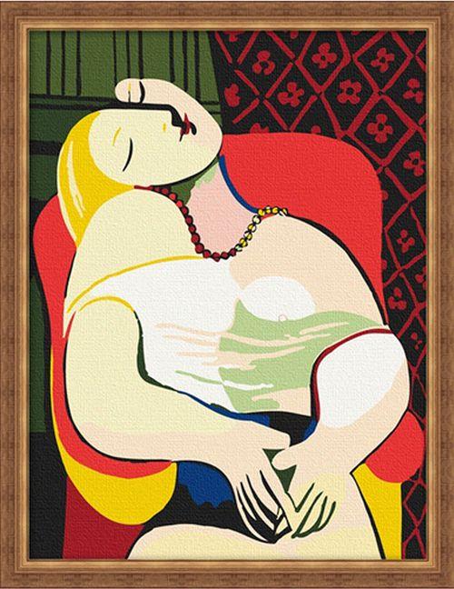 画和雕刻的模特儿。又过17年,64岁的毕加索给她的生日贺信中说:"对我来说,今天是你17岁生日,虽然你已度过了两倍的岁月。在这个世界上,与你相遇才是我生命的开始。"《梦》这幅画作于1932年,可以说是毕加索对精神与肉体的爱的最完美的体现。《梦》是与<;<;镜前的少女>;>;同