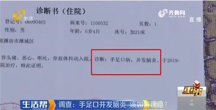 项女士告诉记者:“呕吐很厉害,当时下午去的时候已经是交接班的时候了,也就是说下午5点多去的医院,医生给出的判断是我们得了手足口病发的脑炎。”项女士拿出了一份医院出具的诊断书,上面写明诊断为手足口病并发脑炎,而且进行了住院治疗。她说这就是今年8月份儿子住院医生给出的诊断结果。“(重大疾病是)赔付我们30万,重大疾病里面包括手足口并发脑炎,我们就属于重疾,然后他们现在不给我们理赔。”项女士说。