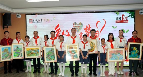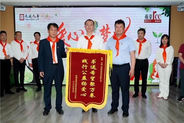长城人寿党委书记、董事长白力与祖庵中心学校校长冯军奇、副校长宋广柱一同为“萌芽100”爱心图书室揭牌,进行图书捐赠,并接受校方回赠的“书送希望聚万卷 践行公益扬爱心”锦旗以及学生书画作品。