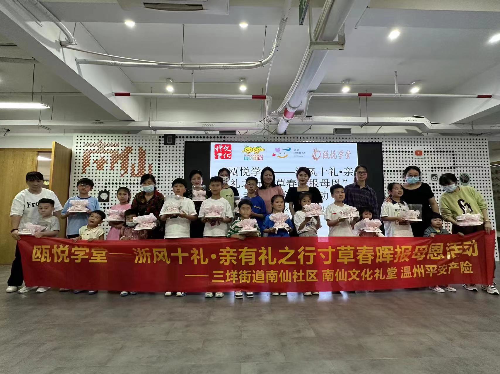 为了回馈广大客户一直以来对平安的支持与信任,5月13日温州平安产险携手南仙社区文化礼堂开展“浙风十礼亲有礼,寸草春晖报母恩”母亲节主题活动,15位母亲携子报名参加。
