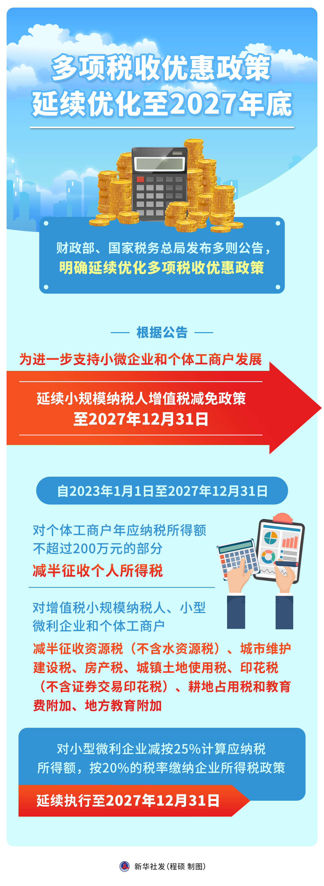 根据公告,为进一步支持小微企业和个体工商户发展,延续小规模纳税人增值税减免政策至2027年12月31日。自2023年1月1日至2027年12月31日,对个体工商户年应纳税所得额不超过200万元的部分,减半征收个人所得税;对增值税小规模纳税人、小型微利企业和个体工商户减半征收资源税(不含水资源税)、城市维护建设税、房产税、城镇土地使用税、印花税(不含证券交易印花税)、耕地占用税和教育费附加、地方教育附加。对小型微利企业减按25%计算应纳税所得额,按20%的税率缴纳企业所得税政策,延续执行至2027年12月31日。