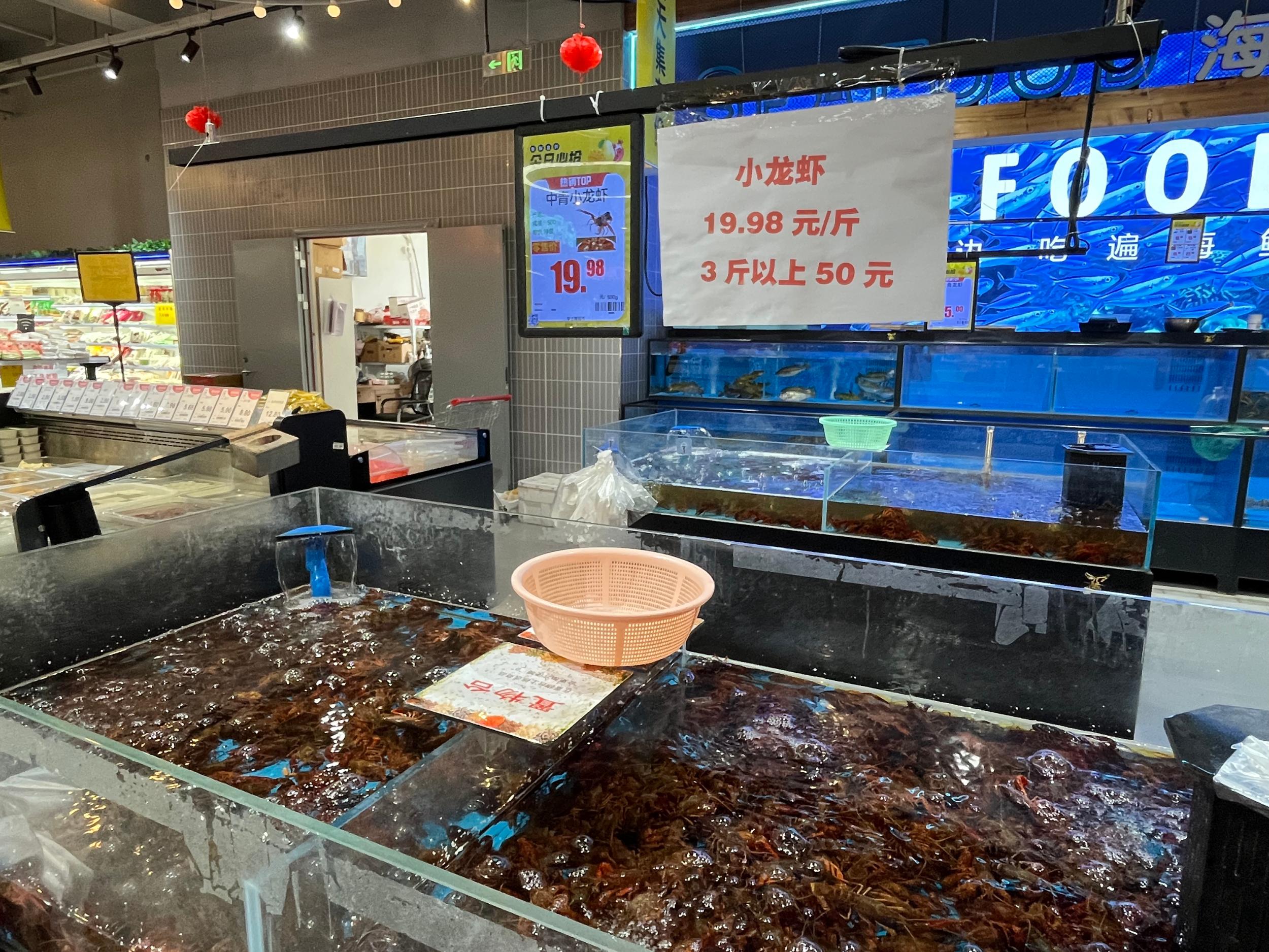 生鲜超市里“50元3斤”的小龙虾价格吸引了众多市民购买。