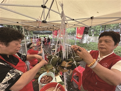 昨天,杨府山幸福志愿站的10多位热心市民正在包爱心粽。连日来,他们每天包爱心粽千余个,将在端午节当日赠送给环卫工人及市民。 蒋文广 摄