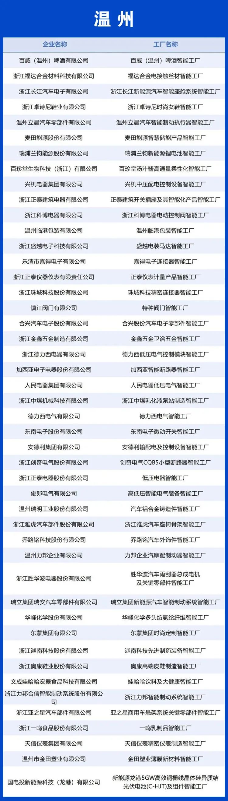 为推动企业对标建设,加快提升浙江智能制造水平,省经济和信息化厅近日公布了2025年浙江省先进级智能工厂(第一批)名单,温州共有46家企业上榜。随小编一起来看↓
