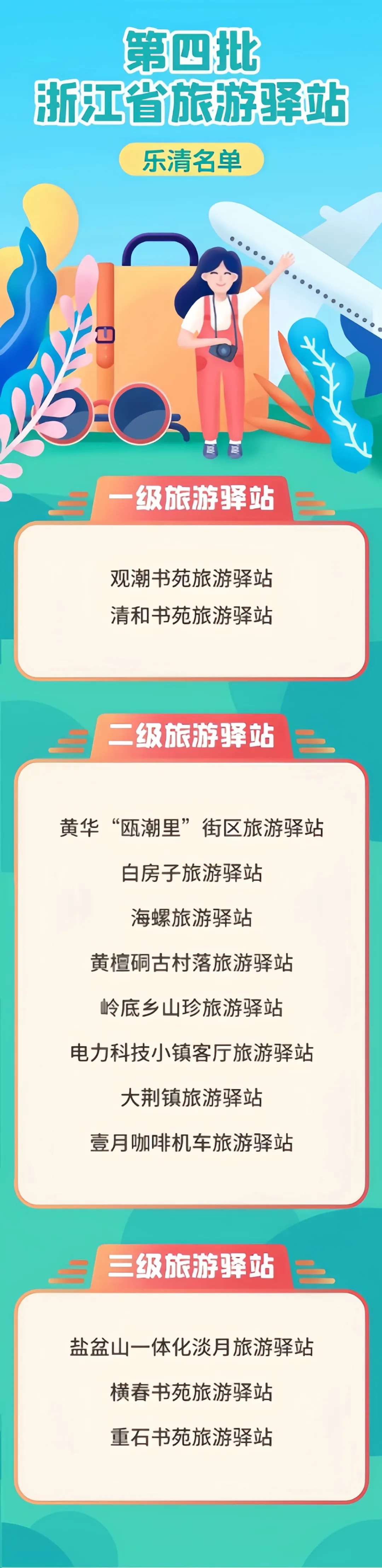 近日,省文化广电和旅游厅认定第四批浙江省旅游驿站,乐清13个入选。其中,一级旅游驿站2个,二级旅游驿站8个,三级旅游驿站3