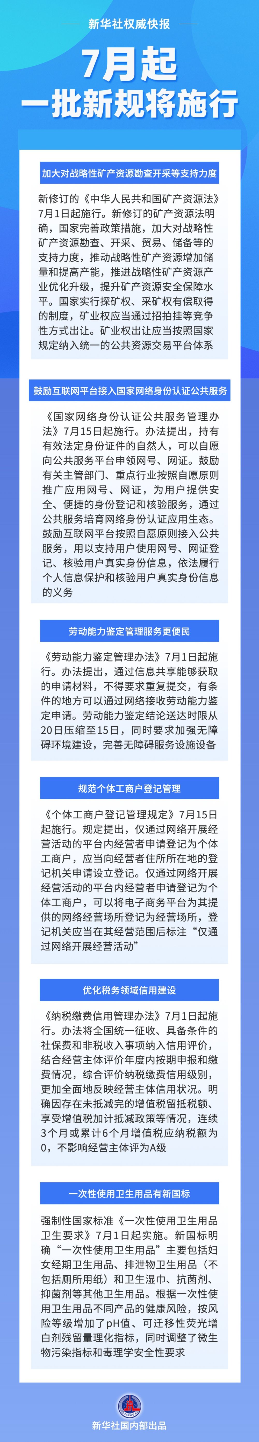 鼓励互联网平台接入国家网络身份认证公共服务;劳动能力鉴定管理服务更便民;规范个体工商户登记管理……7月起,一批新规将施行,一起来看!