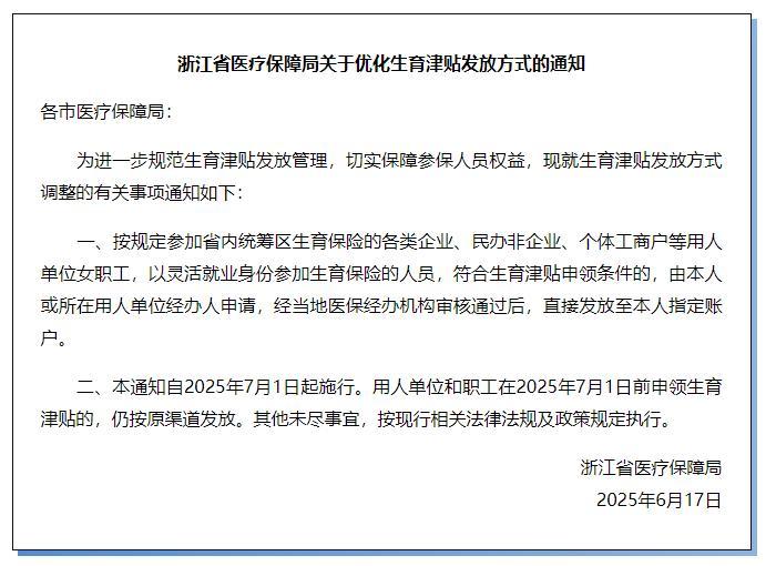 近日,浙江省医疗保障局印发《关于优化生育津贴发放方式的通知》,7月1日起施行。