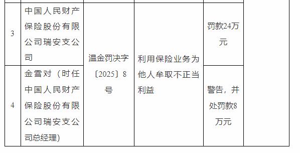 根据国家金融监督管理总局网站近日发布的行政处罚信息公开表(温金罚决字〔2025〕8号)显示,因利用保险业务为他人牟取不正当利益,国家金融监督管理总局温州监管分局对中国人民财产保险股份有限公司瑞安支公司罚款24万元;金雪对(时任中国人民财产保险股份有限公司瑞安支公司总经理)警告,并处罚款8万元。
